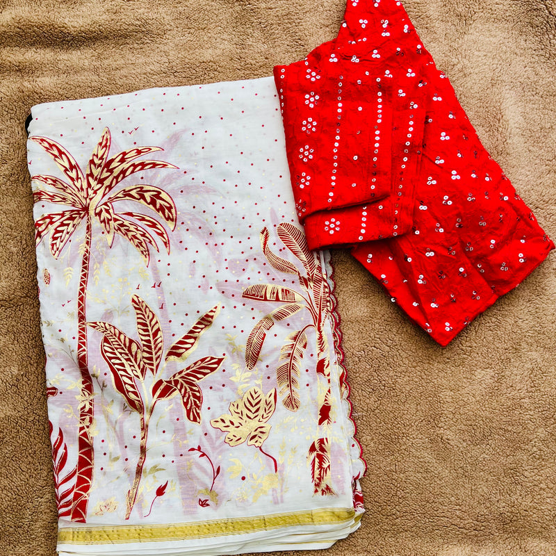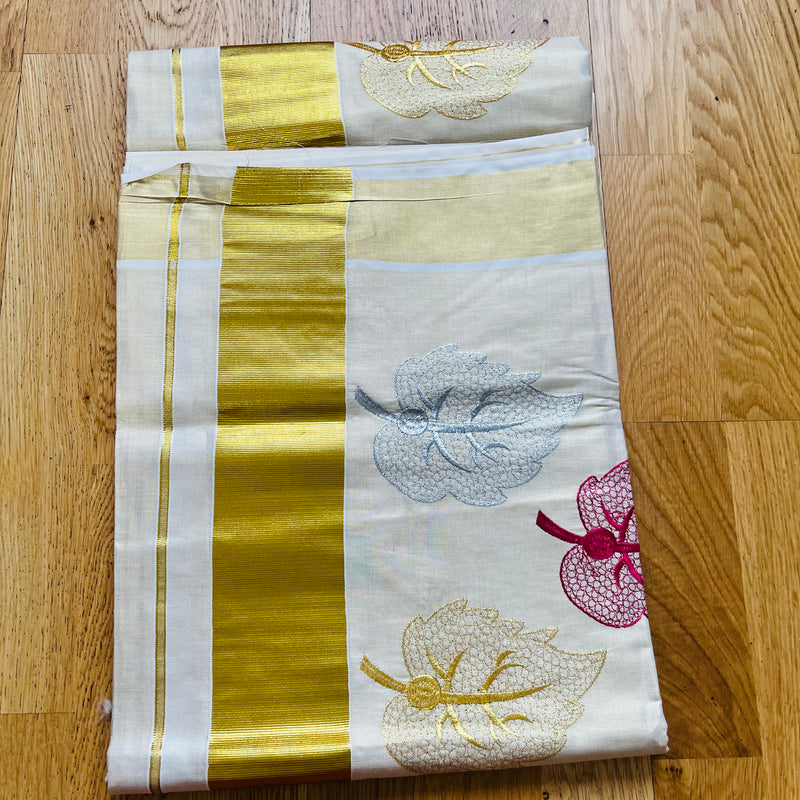 Kerala Set Saree with Embroidery leaf pattern and Golden Zari Border.