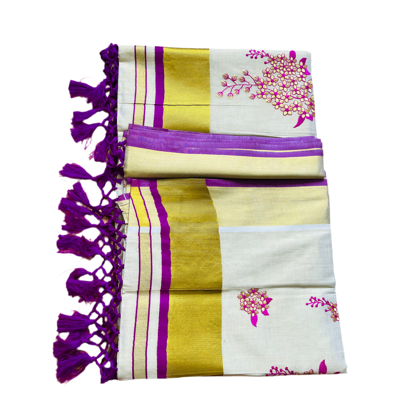 Kerala Set Saree flower Embroidery, Tassels and golden Zari Border.