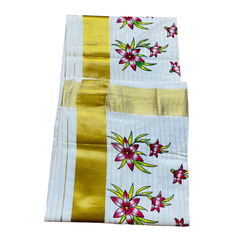 Kerala Set Saree with multicolour flower print with golden embroidery, Red and Gold Border.